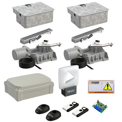 SET 2 electromechanical underground motors BRUSHLESS low voltage, super intensive use, with native encoder on-board, irreversible, ideal for swing gates with leaf up to 4.5 m. Standard version with short 2 m cable, with hot galvanised steel foundation boxes and cover and standard lever release system. Complete with electronics kit.