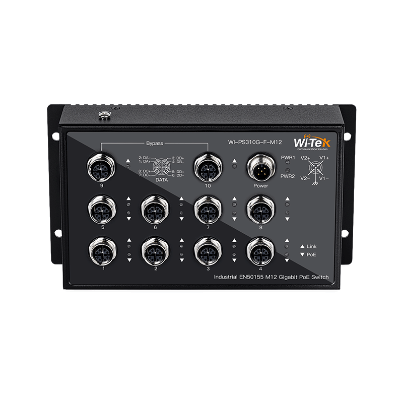 • 8 x M12 (X-code) Gigabit PoE+ ports and 2 x M12 (X-code) Gigabit port with bypass function